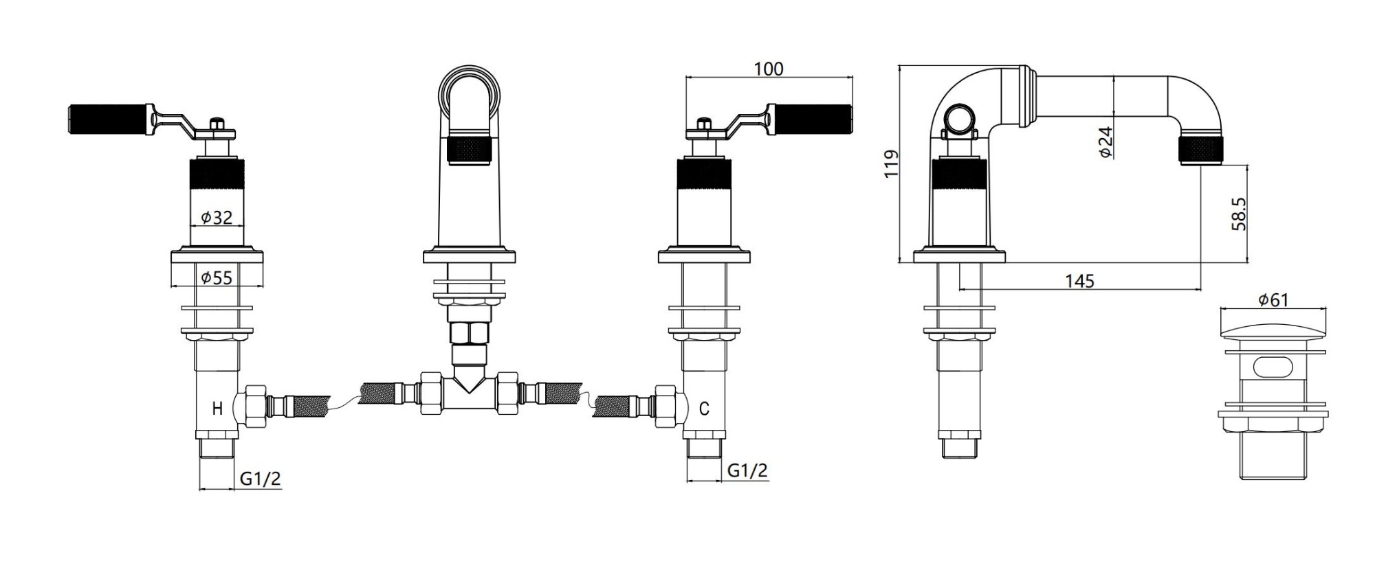 Luxuriously Industrial Style 3holes Basin Mixer+Click Waste