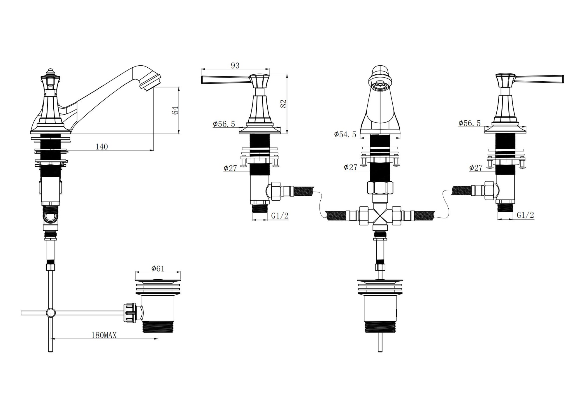 Traditional 3 holes basin tap with brass pop-up waste with Traditional octagonal lever handle