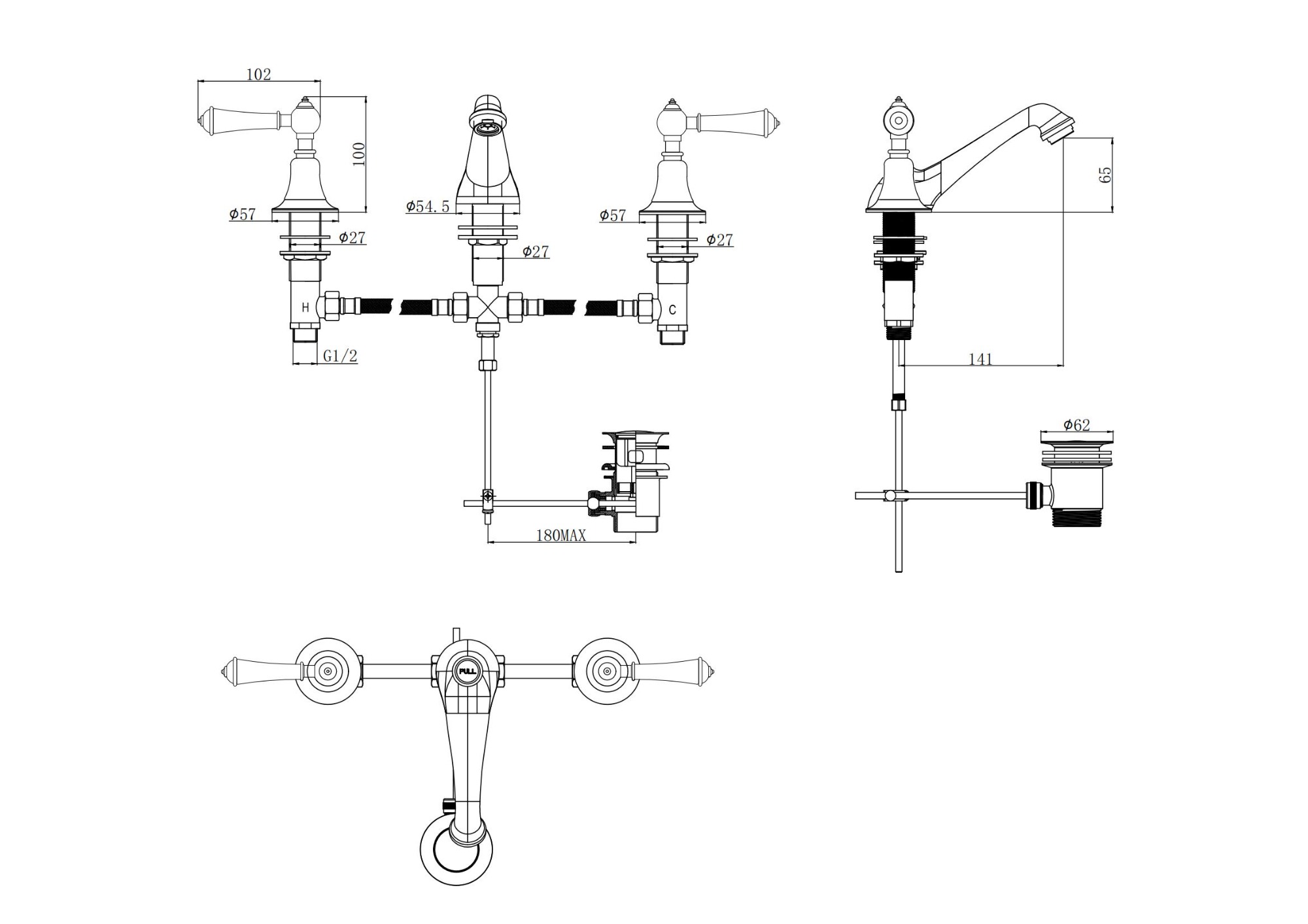 Traditional 3 holes whole brass basin tap with brass pop-up waste with Traditional lever handle