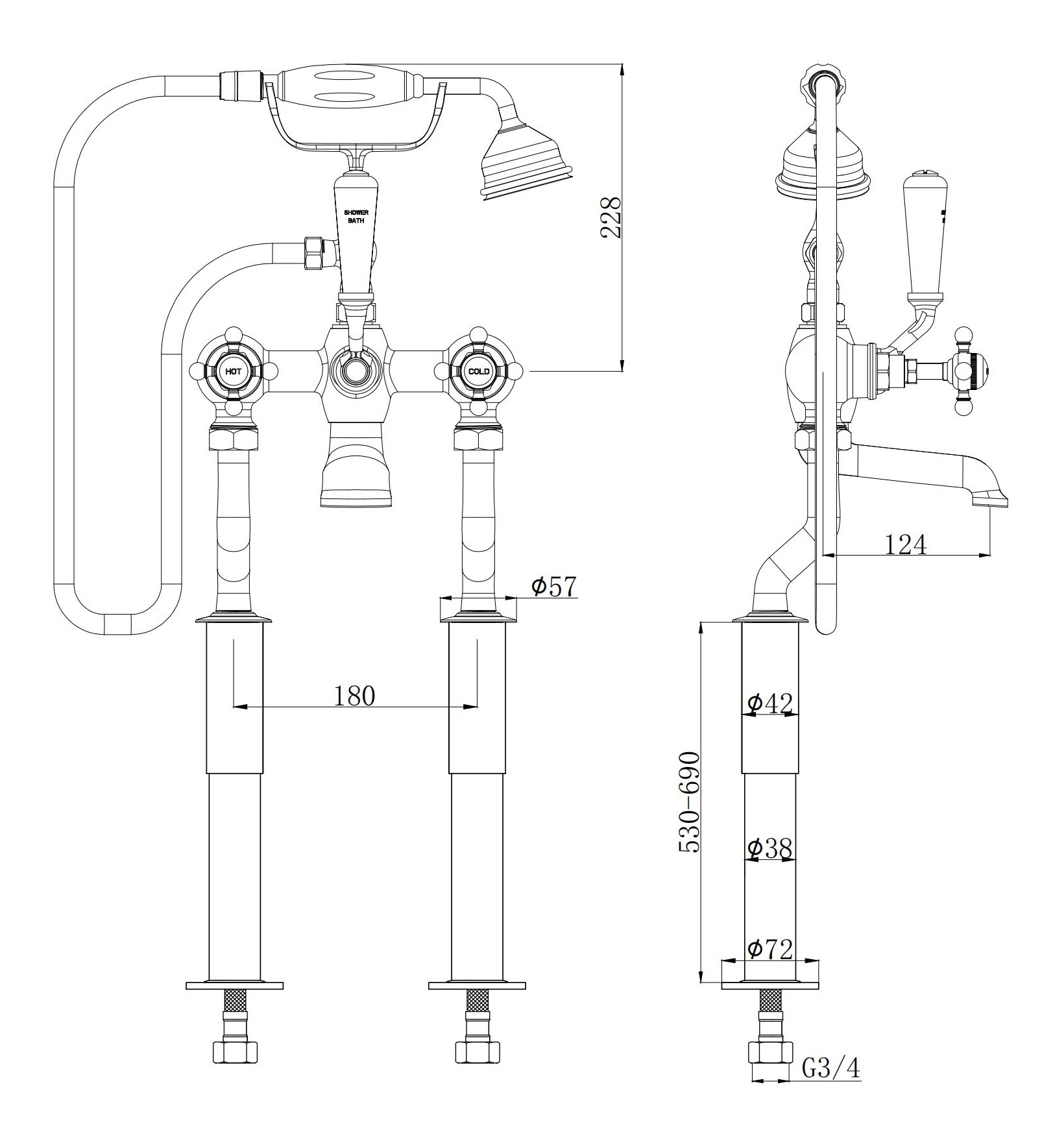 Traditional floor mounted whole brass bath tap with shower with extension leg